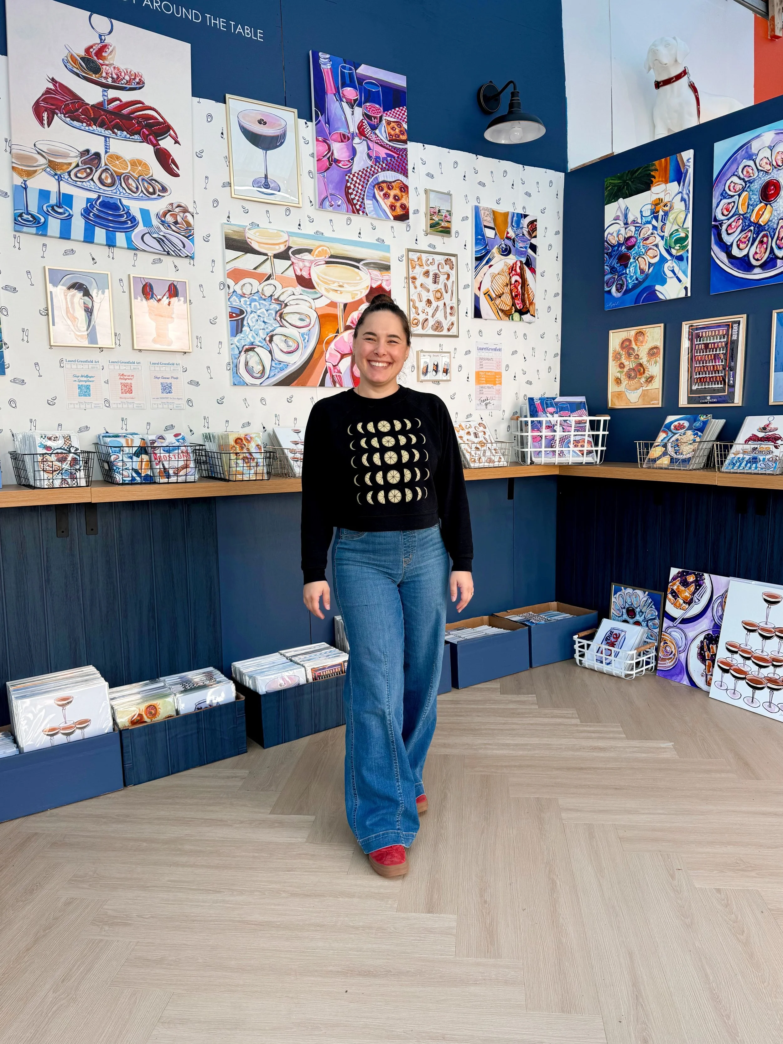 She creates original acrylic paintings, fine art prints, greeting cards, and products. Her style is best described as bold, graphic, vibrant, and joyful. She sells her art at her permanent shop in Boston Public Market, online, and at seasonal pop up events.